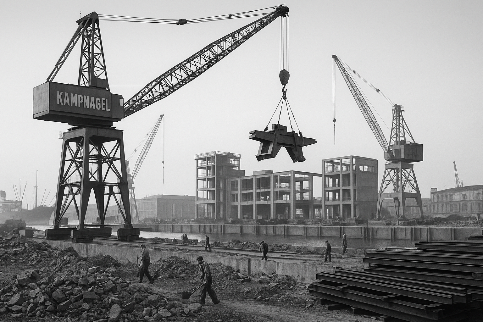 After the end of the Second World War, Kampnagel resumed production of its original products: ship loading and harbor crane technology. The company regained international relevance, and cranes bearing the Kampnagel name were installed in ports across Europe and overseas—many of which remain in place to this day.